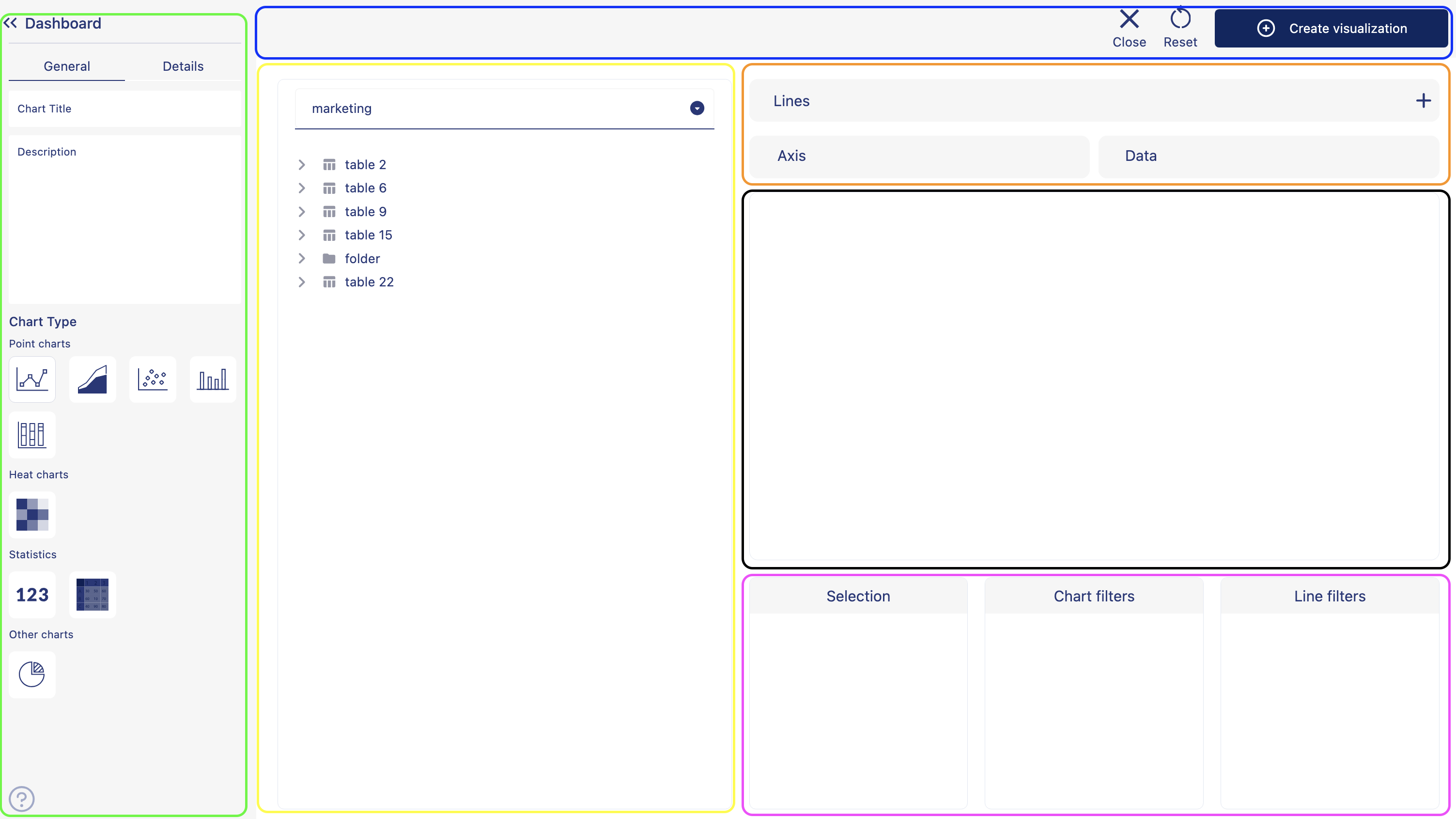 Placeholder for axis, data and line creation along with line filter changes depending on the chart we choose. For example, you need to create line, and have the option to apply line filter if you choose a chart from the point chart type. If you choose heatmap, you now have placeholder for X-axis, Y-axis, and data chip. You do not have the option to apply line chart anymore. Choose different chart types from the side panel, do you notice the changes?