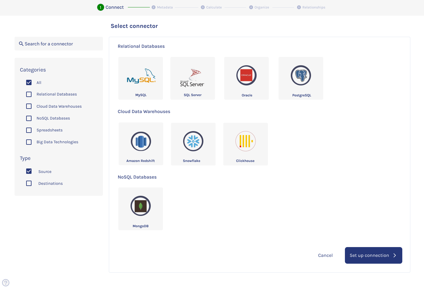 Setting up data connection involves: connecting your data warehouse to the platform, adding meta data, creating relationships, creating formulas and organize data into a catalog.