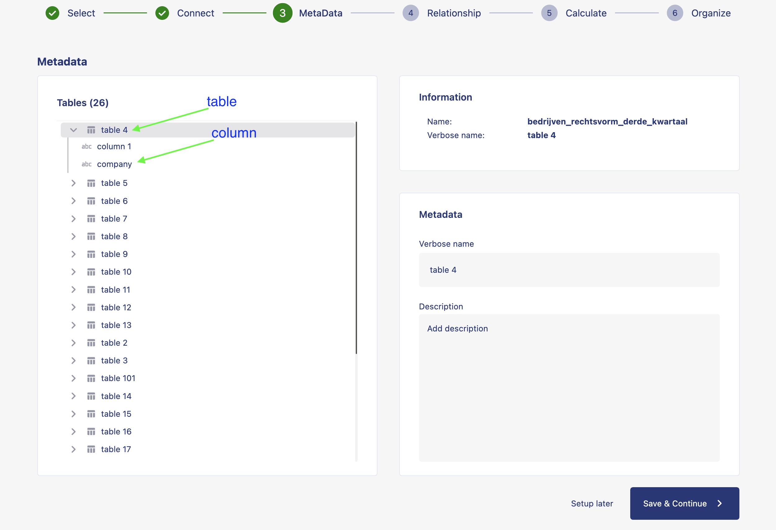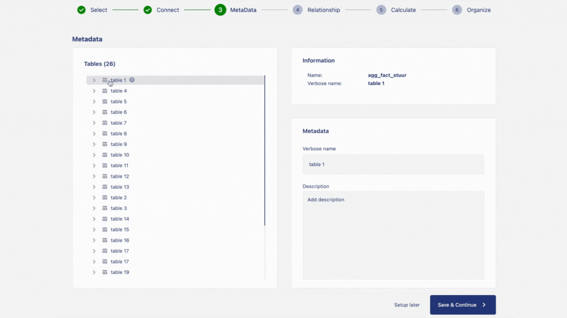 1. On the page to set up meta data, on the left-hand side container, we can see the list of tables and columns from the data source. On the right-hand side, on top container we can see the information related to the selected table or column from the source. Below the information container, we can see the container with the option to input meta data such as verbose name (a given name to your table different from source name) and a box to add description to the selected item.